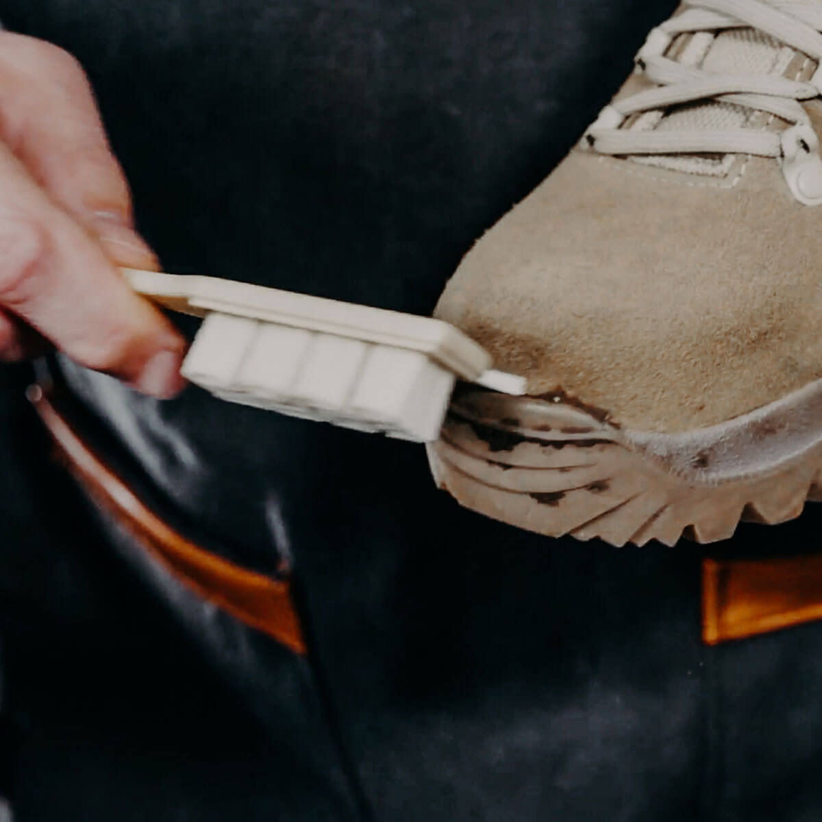 Les taches localisées peuvent être enlevées avec la gomme à daim Saphir Gommadin. Frottez doucement le bloc sur la tache, en appliquant la pression nécessaire. Le bloc se désintégrera légèrement, ce qui est normal. Utilisez une brosse en crêpe ou une brosse similaire pour enlever les miettes, laissant une finition sans tache.