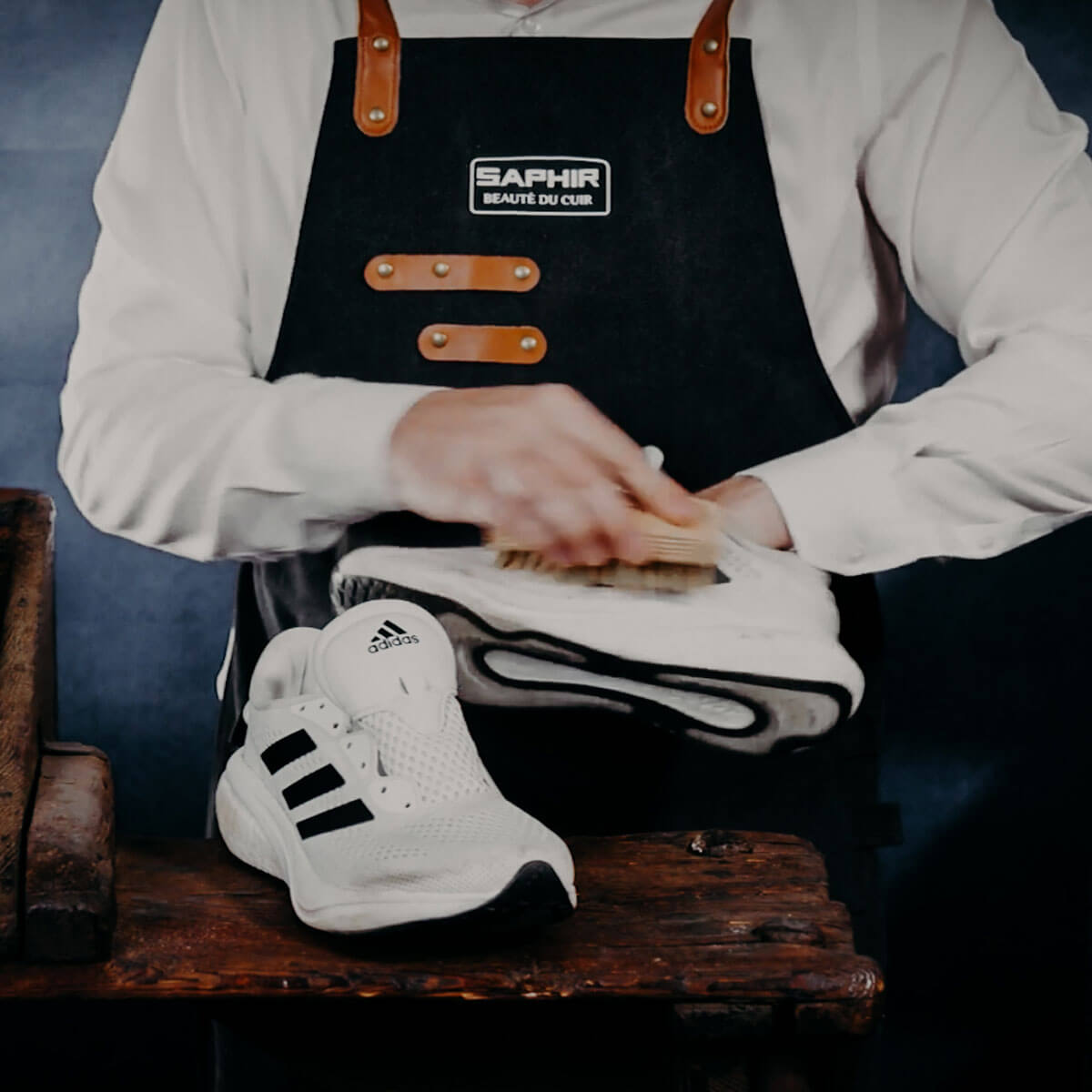 Commencez par retirer les lacets, puis utilisez une brosse Saphir pour éliminer la saleté et les débris de vos sneakers.