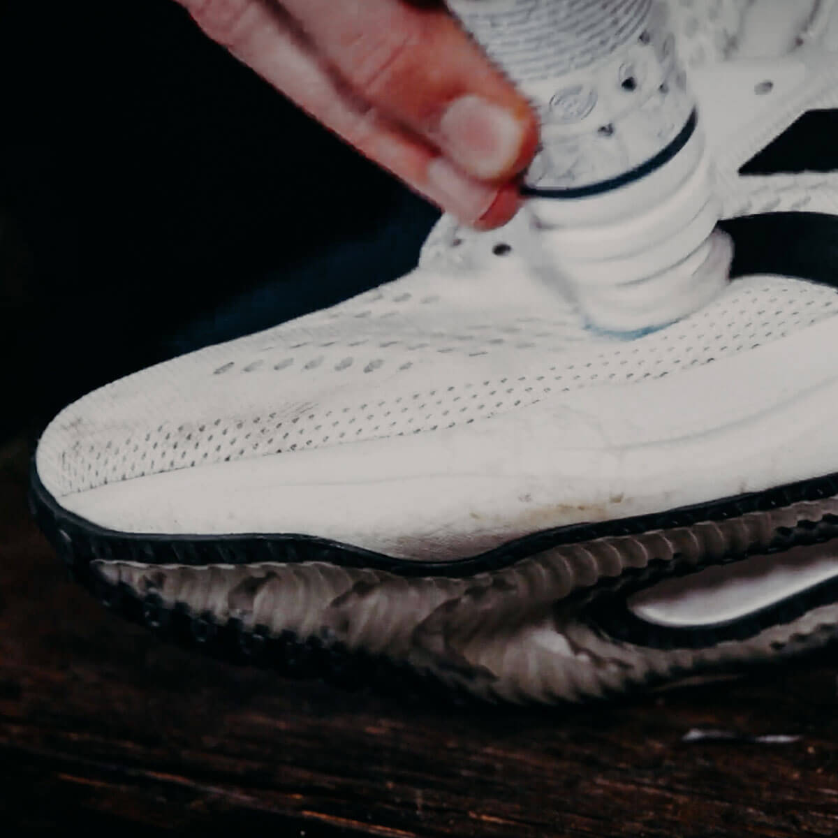 Si vous avez des taches persistantes de boue, nous recommandons d'utiliser le Sneaker Cleaner Saphir. Le Sneaker Cleaner est équipé d'un tampon applicateur composé de deux parties : une partie en mousse douce qui applique le nettoyant sur les sneakers et une partie plus abrasive qui permet au nettoyant de pénétrer le matériau sans endommager les surfaces.